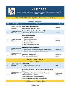 Nile Care Inc. cordially invites all members to attend the upcoming May Forum, an important gathering where members will have the opportunity to hear directly from the board about the organization's accomplishments and initiatives over the past year.